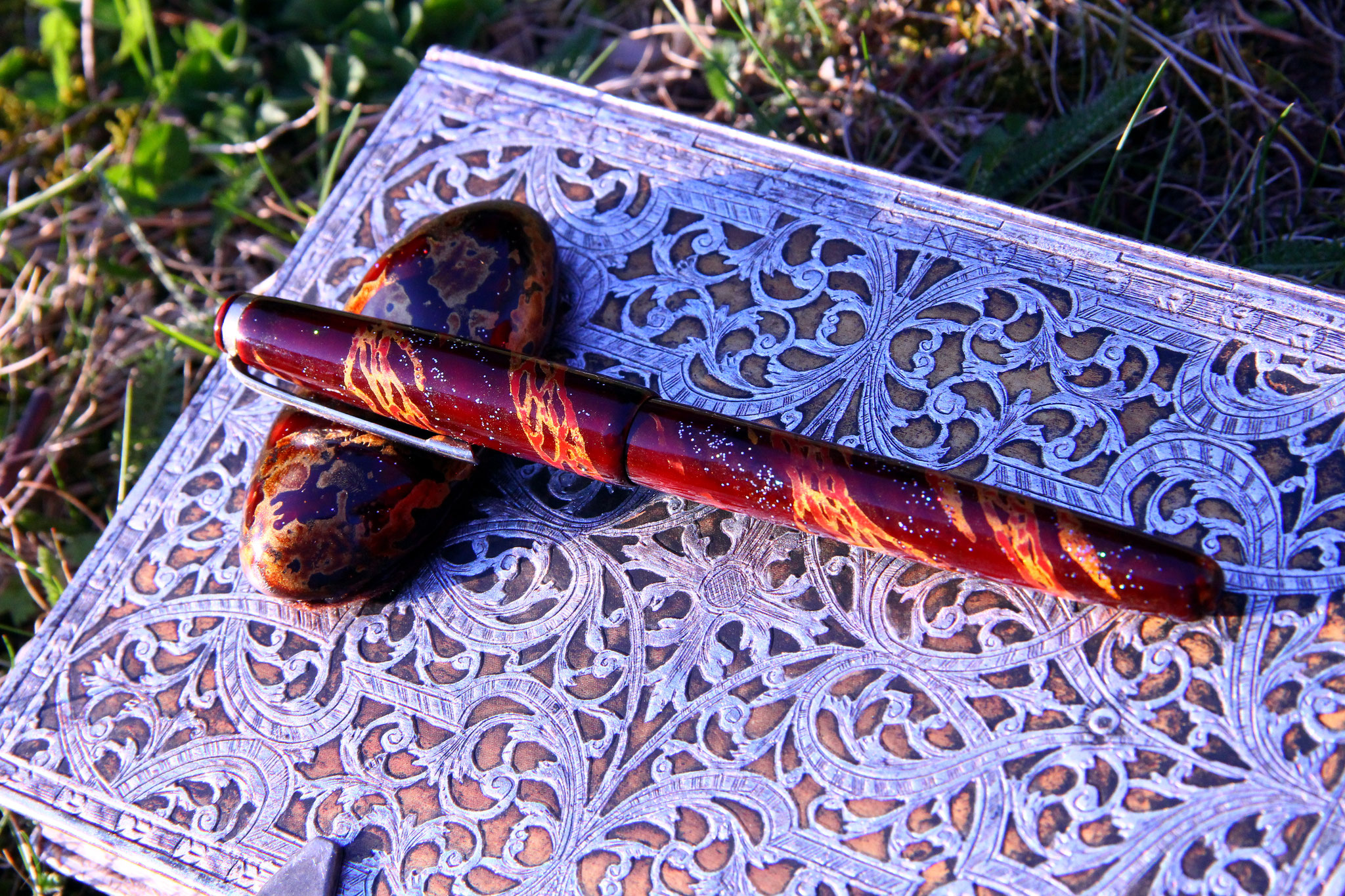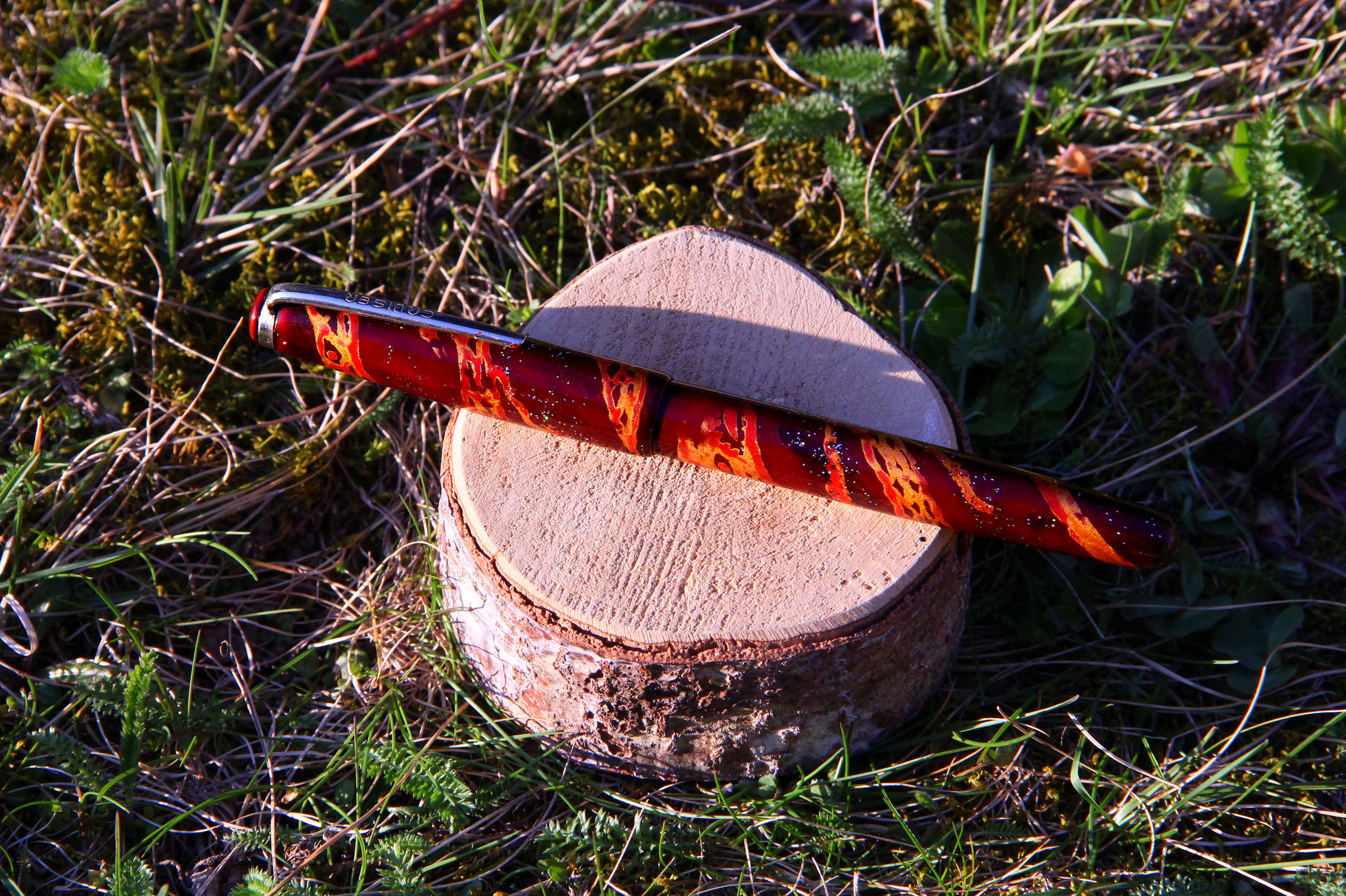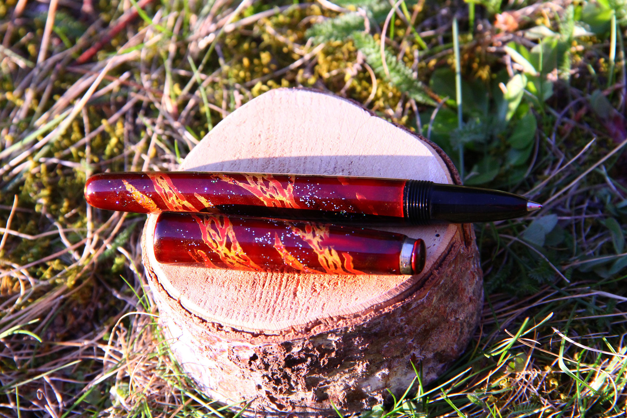 The "Snake" ballpoint pen is a cigar shaped small pen, featuring a snake pattern of gold and red, made of black, red and clear urushi with metal hologram pigments und gold powder. The pen has been covered in 4 layers of black and red base urushi lacquer (wet sanded with #1000 grid sandpaper after each application and curing). The snake pattern was painted in red urushi and gilded with powdergold. The next layers where done with clear urushi, until the pen seemed to be almost black - brown in color. Once the urushi was completely cured, the pen was wet sanded until the gold became visible and showed through the lacquer. For the finishing kijo-mi urushi got applicated on the pen and wiped off with filtering paper. After curing for additional 24hrs, the pen got polished. Length of the production process: 2 months.