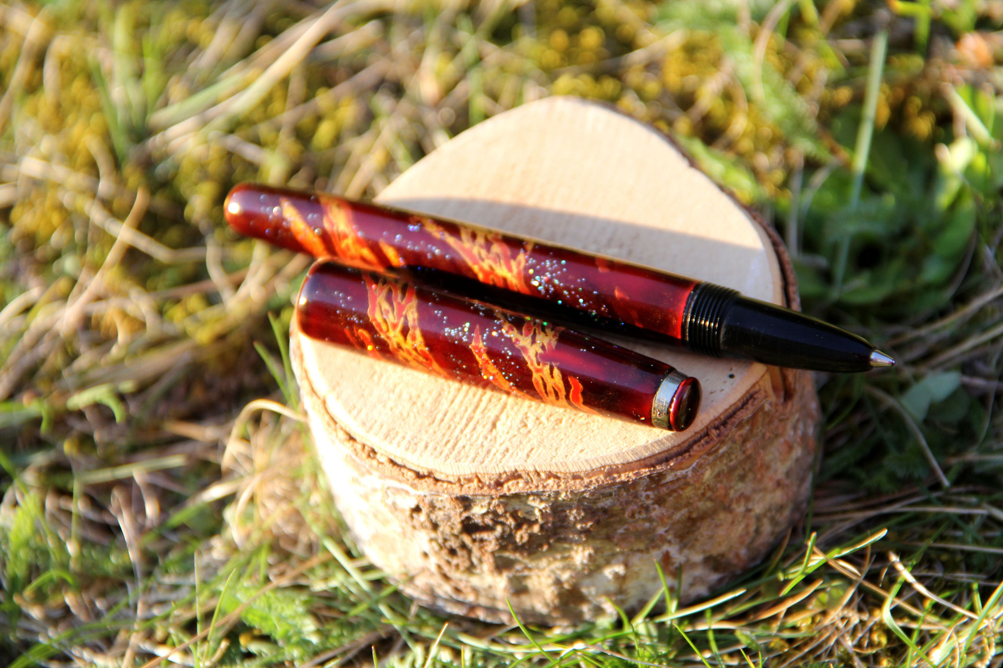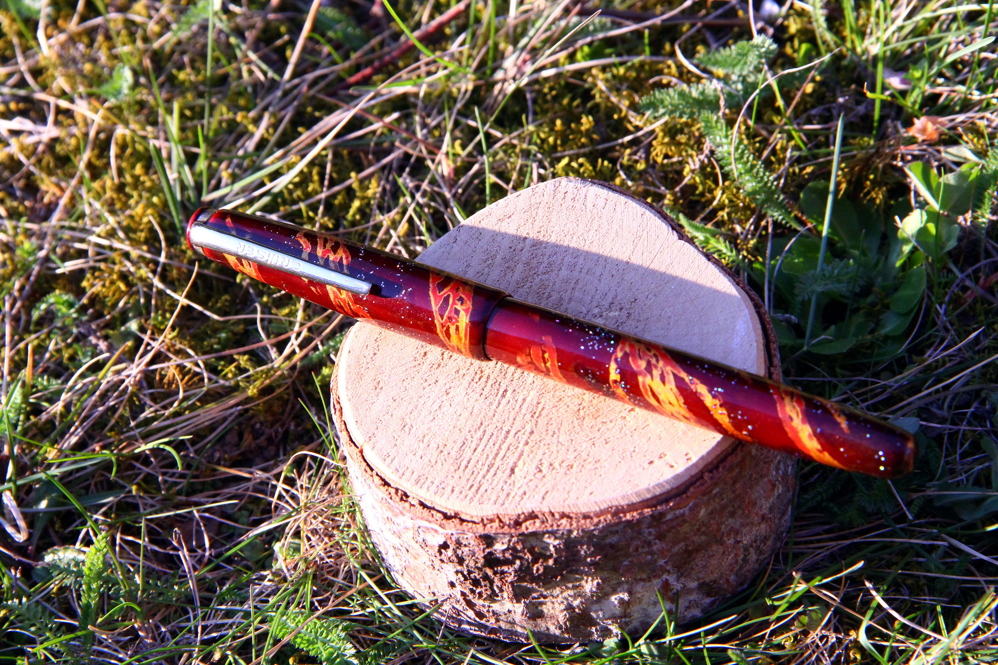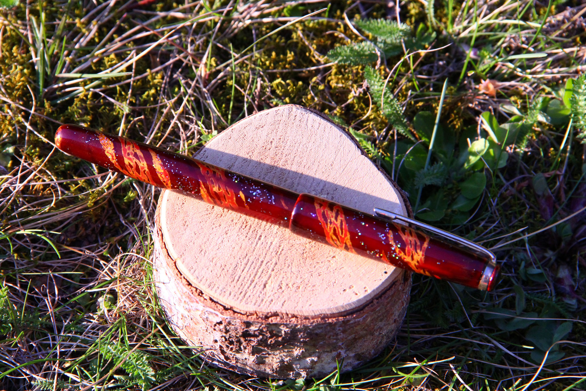 The "Snake" ballpoint pen is a cigar shaped small pen, featuring a snake pattern of gold and red, made of black, red and clear urushi with metal hologram pigments und gold powder. The pen has been covered in 4 layers of black and red base urushi lacquer (wet sanded with #1000 grid sandpaper after each application and curing). The snake pattern was painted in red urushi and gilded with powdergold. The next layers where done with clear urushi, until the pen seemed to be almost black - brown in color. Once the urushi was completely cured, the pen was wet sanded until the gold became visible and showed through the lacquer. For the finishing kijo-mi urushi got applicated on the pen and wiped off with filtering paper. After curing for additional 24hrs, the pen got polished. Length of the production process: 2 months.